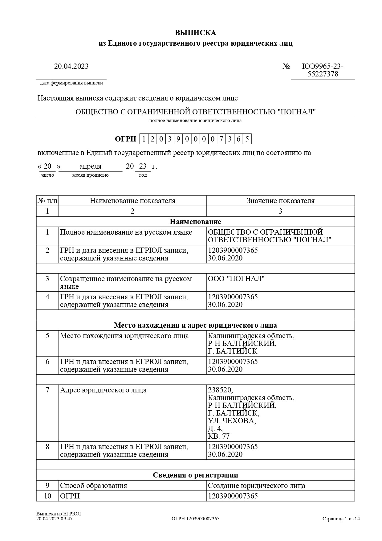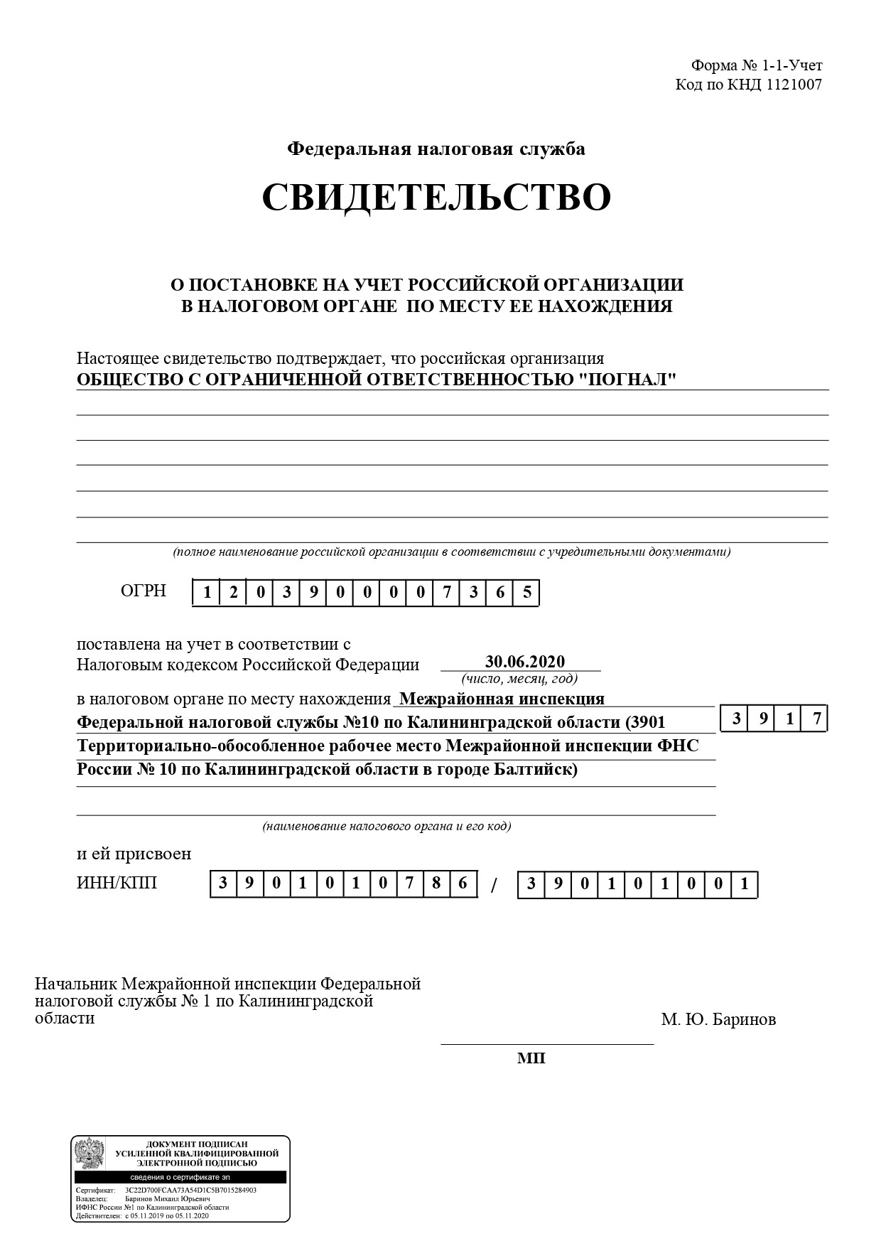 ОГРН: 1203900007365